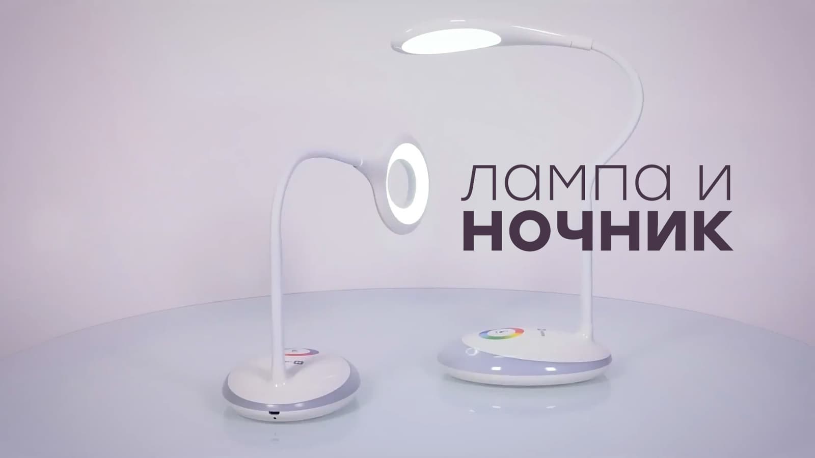 Встроенный аккумулятор. RGB-подсветка основания. Сенсорное управление. Гибкая ножка.
