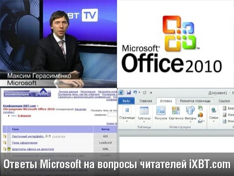 Тема сегодняшнего разговора — программный пакет Microsoft Office 2010. В нашей конференции forum.ixbt.com мы создали для читателей специальный форум, посвещенный обсуждению бета-версии Microsoft Office 2010. Мы собрали вопросы и на наиболее интересные из них сегодня ответит представитель компании Microsoft. Ответы на вопросы, не вошедшие в видеоролик, можно прочесть на сайте iXBT.com.